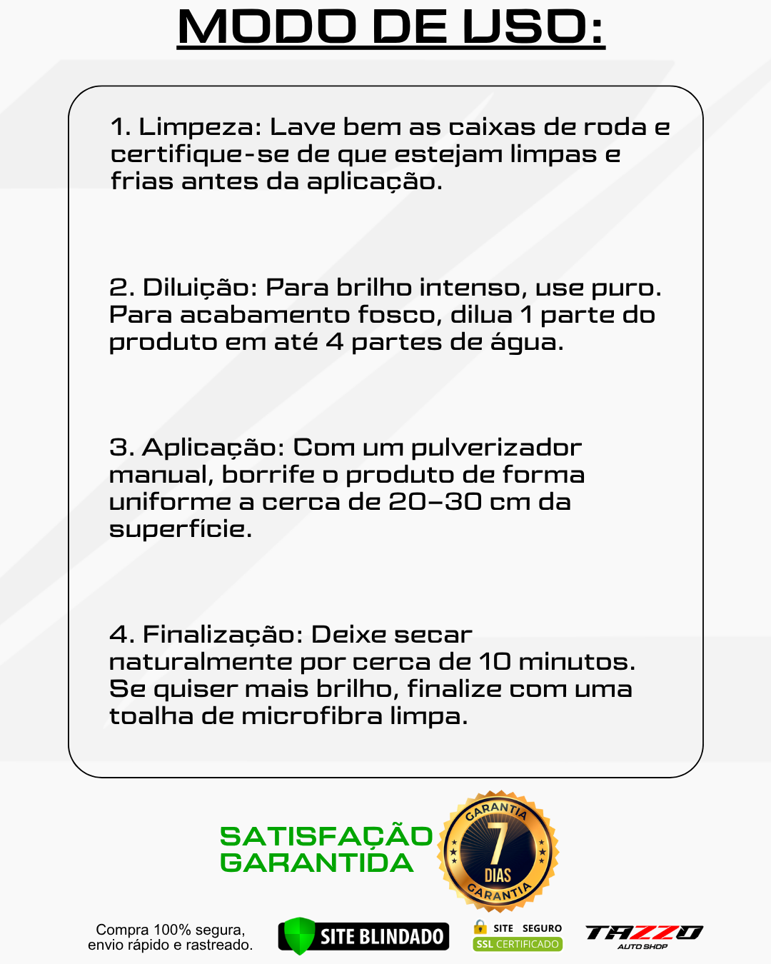 Olá, Nós somos a Tazzo Auto Shop, uma empresa especializada na distribuição de produtos automotivos de alta performance. O nosso propósito é impactar a vida das pessoas de forma positiva, levando informação, segurança, lazer e um novo conceito de cuidar do carro através da distribuição de produtos de alta performance. Nossa organização é composta pelos seguintes valores: Honestidade, Humildade, Comprometimento, respeito e a vontade de querer ir sempre além.