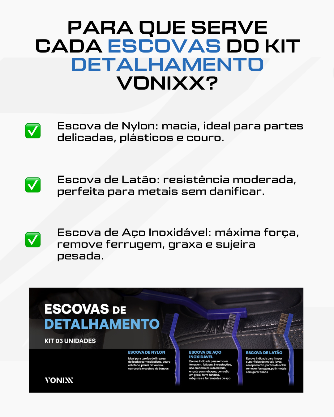 KIT 3 ESCOVAS PARA DETALHAMENTO CERDAS NYLON LATÃO E AÇO INOXIDÁVEL